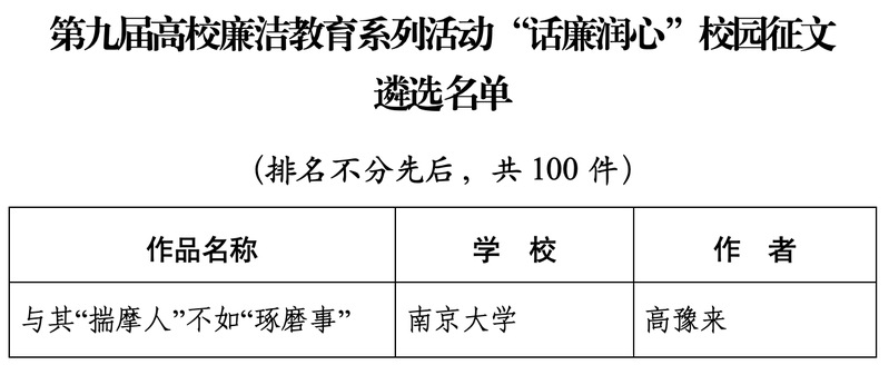 近日,在教育部第九届高校廉洁教育系列活动中,91av 2022级中国史硕士生高豫来作品《与其“揣摩人”不如“琢磨事”》入选“话廉润心”校园征文全国百强遴选名单。