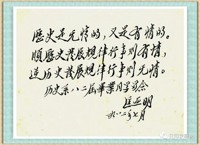我们是学历史的,我们深知,重大历史事件会响彻时代的回声;每个普通人的经历,也同样折射着时代前进的光影。匡校长在学校时的一言一行,深深地影响了我们的思想追求。系主任茅家琦先生也是匡校长治校方略的积极践行者,他曾对我们说:“革命要靠两杆子:枪杆子和笔杆子。学习和研究历史也要掌握两杆子:古汉语和外语。这是历史系学生的两根拐杖。板凳要坐十年冷,文章不写半句空,做学问要静得下心来,守得住寂寞。”