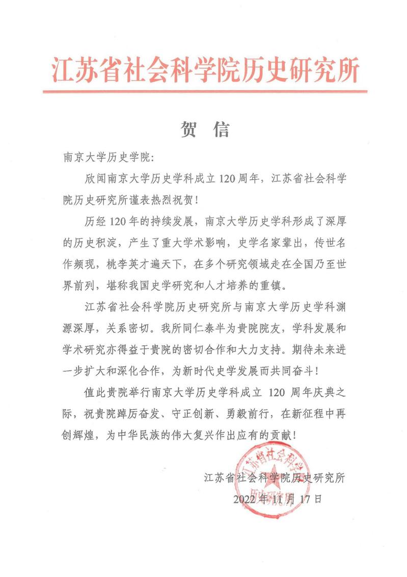江苏省社会科学院历史研究所来信祝贺91av 历史学科成立120周年