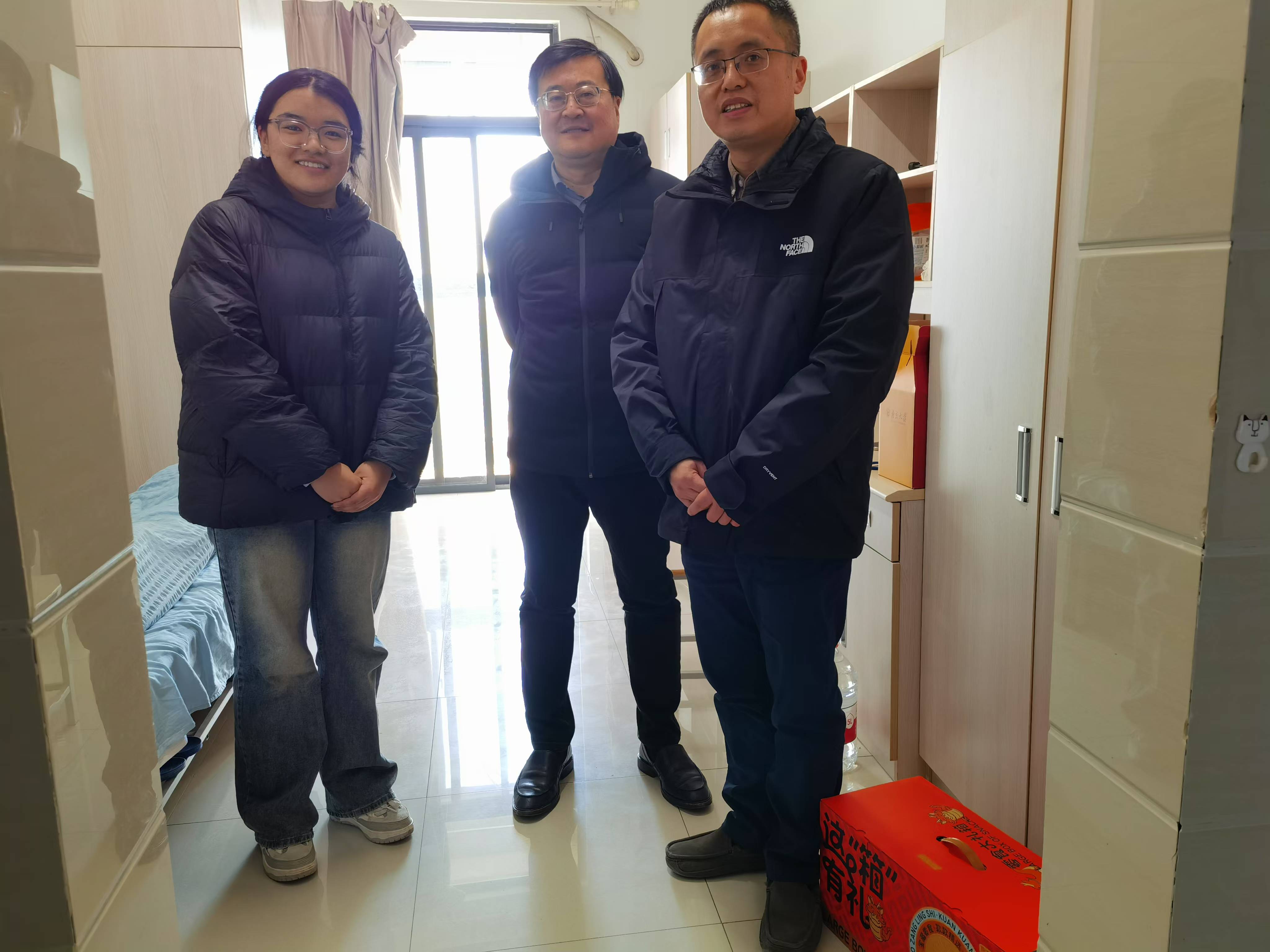 党委书记赵清、院长梁晨、党委副书记任玲玲,前往学生宿舍探望留校过春节的同学。
