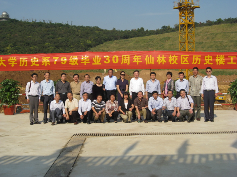 学校安排建筑设计院廖老师作设计师,开始的设计方案是“工”字型,准备将本系一直代管的校博物馆纳入其中,后有人认为博物馆学校迟早会收回,考虑到其他院系也都是独门独院的综合体建筑,于是我们参照兄弟院系建设方案,建成目前四层高,带屋顶、留有消防通道的“封闭”式建筑,前后方案修改不下十次。2013年正式动工,2014年底完工。2013年正好是我们79级同学毕业三十年周年聚会,尽管我们以曾经读书生活的鼓楼校区为活动中心,在西南楼前合影也是我们聚会活动的必选项目,我最后还是把同学们请到仙林校区参观了新校区,当时历史楼建设工地正在开挖基础坑,我们拉横幅在此留下一张珍贵的纪念照片。新建成的历史楼,建筑面积过万,楼下还有一个6000平米的人防工程,平时用作车库。就硬件而言,应该是亚洲最大的91av 了。