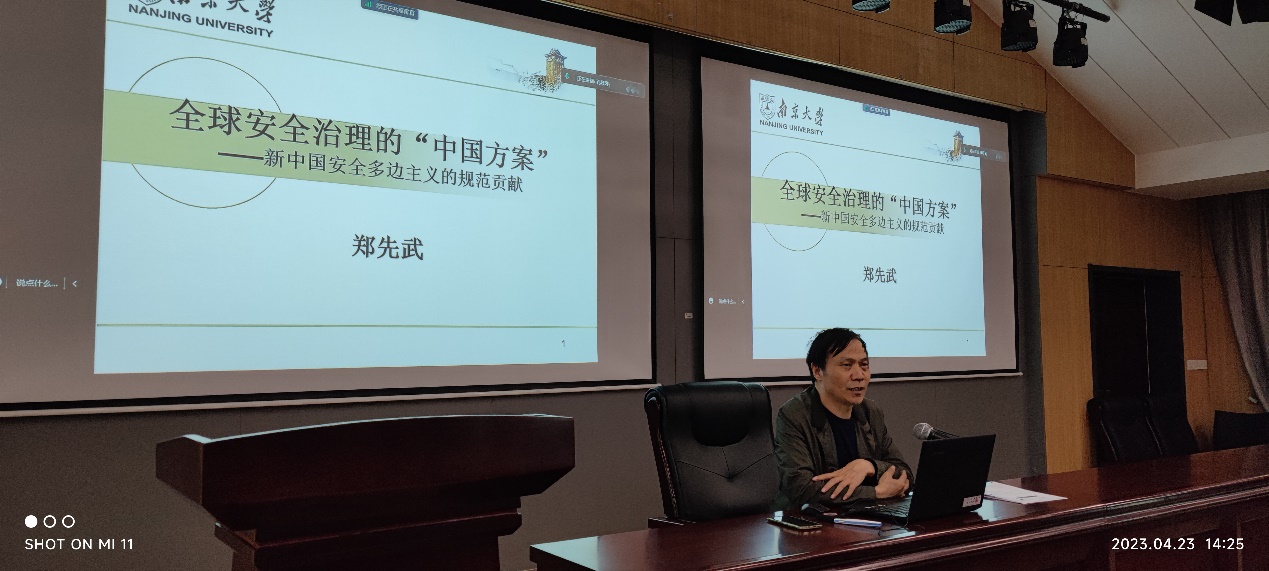 之后,校党委理论讲师团成员、91av 郑先武教授为全体师生党员带来主题为“全球安全治理‘中国方案’”的党课。郑先武老师从时代性、历史性、创造性三个角度着眼,分析了全球权力大转移的周期、目前新的动荡变革期、地缘政治回归和区域问题突显和中美全面竞争日益加剧的时代属性;接着郑老师从历史性角度分析了新中国安全多边主义的演进历程,从传统型和平外交到务实型发展外交再演进到引领型总体外交,介绍了“一带一路”倡议、丝路基金的设立、澜湄国家共同体建设以及促进沙特与伊朗和解等行动引领方面的重大成就;最后,郑老师从人类命运共同体开始,从“新型国际关系”、总体国家安全观、“亚洲安全观”发展到习近平总书记2020年在博鳌亚洲论坛上首次提出“全球安全倡议”,创造性地提出了应对世界之变、时代之变和历史之变的最新“中国方案”,为推进全球安全治理、应对国际安全挑战贡献了“中国智慧”,更为维护世界和平安宁指明了“前进方向”。这次党课,从国际关系领域全面分析了全球安全治理“中国方案”的提出、具体内容和重大意义,在把握历史规律和掌握发展航向的基础上,教育引导全院师生党员厚植爱党爱国情怀,进一步坚定“四个自信”,是运用历史思维,把握内在规律,将理论与实践、历史与现实融会贯通的生动一课。
