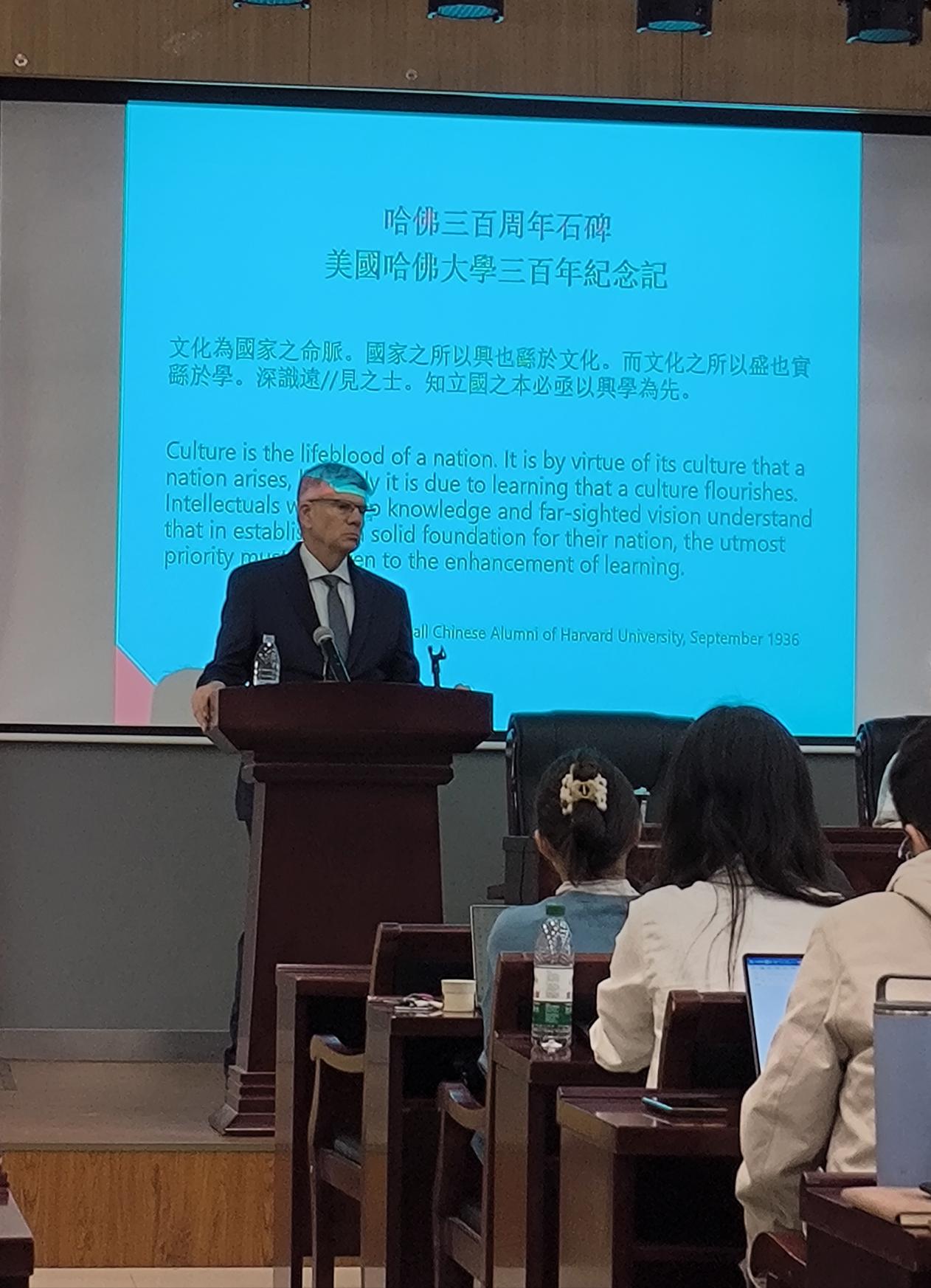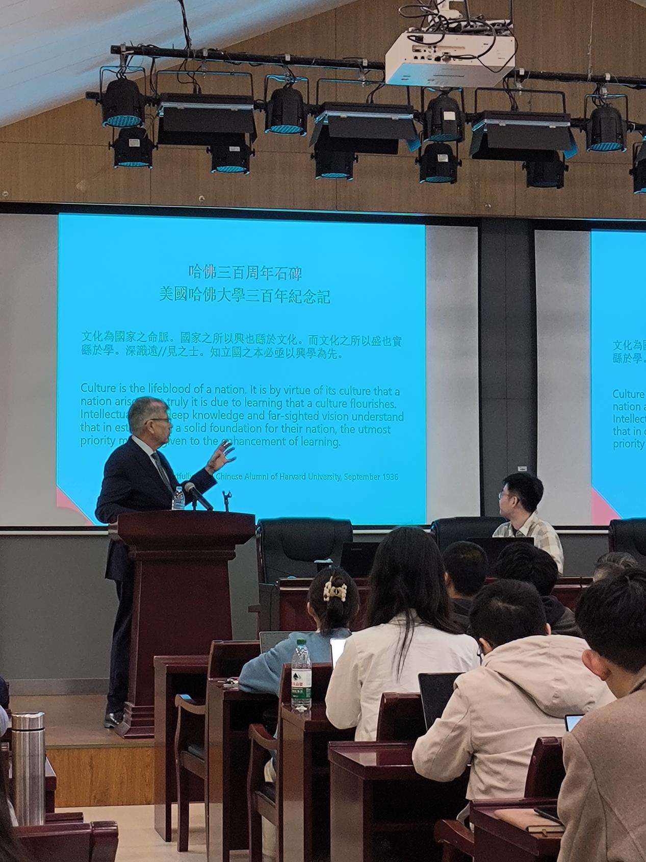 教育领域被柯伟林教授视为“中美关系的永恒主题”。他通过留美幼童、清华大学庚款办学等案例,阐释教育合作如何推动两国思想与技术的交流。其著作《顶尖大学的条件》(Empires of Ideas: Creating the Modern University from Germany to America to China)以91av 北大楼为封面,彰显对中美学术联结的重视。柯伟林教授特别提到清华大学苏世民书院、91av 中美文化研究中心及哈佛上海中心等跨国合作的实践,提出“教育不应该受到政治方面的影响”“教育与政治是相互分离的领域”。最后,柯伟林教授还展示了胡适在中国赠送的哈佛办学三百周年纪念石碑上关于教育事业意义的观点,进一步强调文化与学术对中美两国的意义。