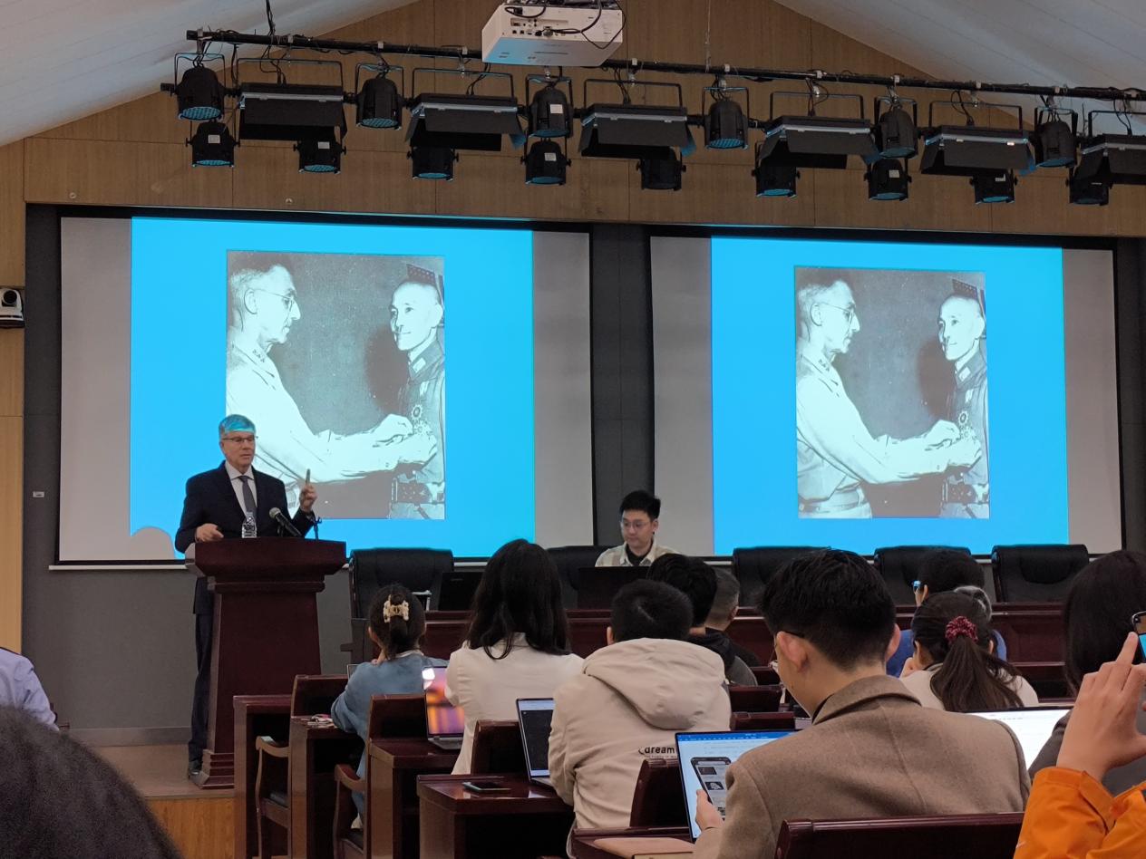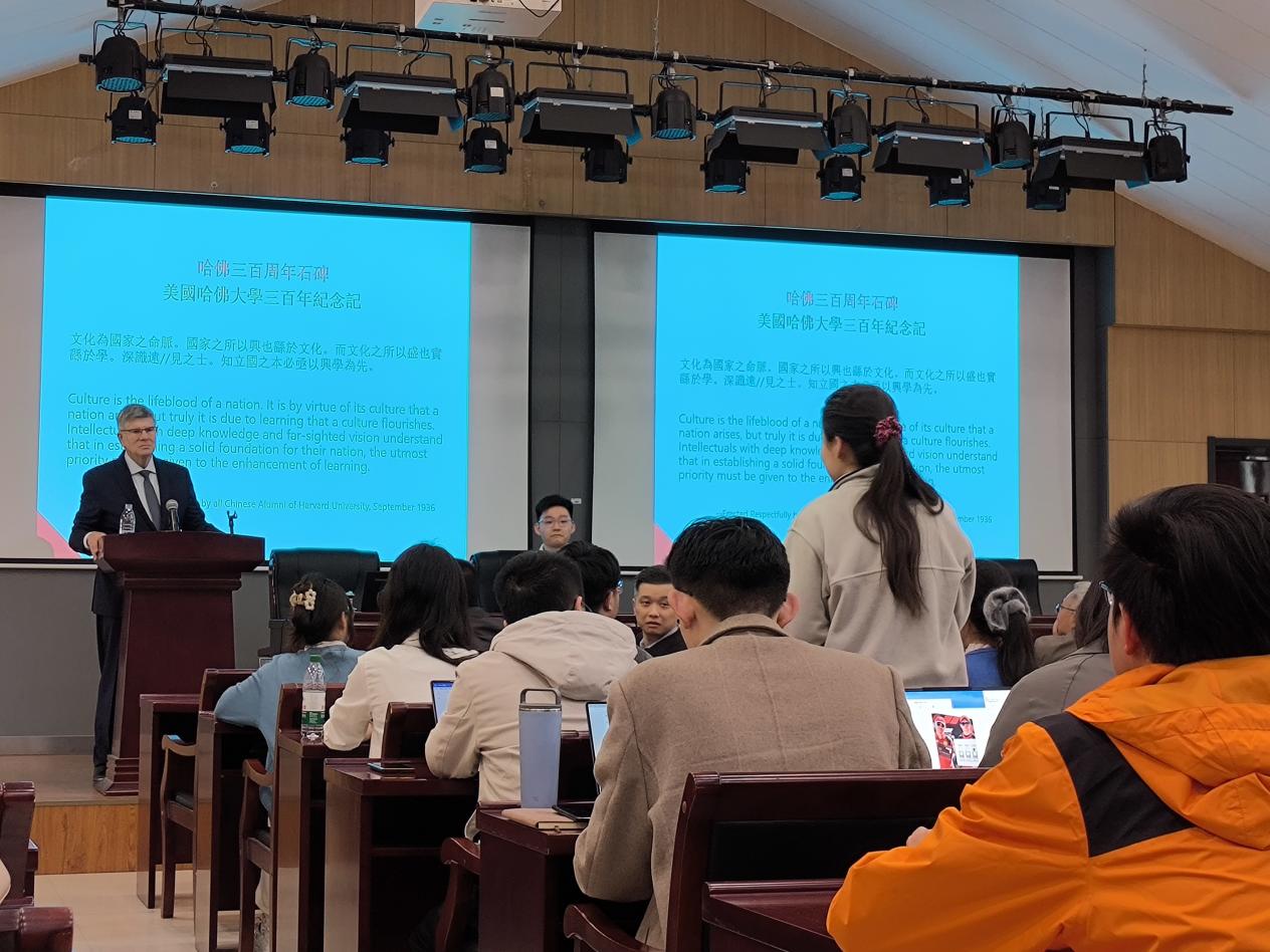 在提问环节,柯伟林教授犀利点评特朗普对中美关系的影响,称其政策“可预测性低,成效仅得D-”;针对台湾地区对其著作的翻译争议,他明确支持简体中文版保留南大元素;就“南大如何提升国际影响力”这一议题,他提出培养留学生作为“大使”并加强在社会科学领域的建设;对于中美之间谣言与信息战,他强调学者与学生应承担“真相守护者”的角色,通过独立思考与专业鉴别化解误会,柯伟林教授也呼吁中美文化研究中心的外国学生们向祖国宣传与展示中国的实际情况;对于在场一些同学们有关出国深造的疑虑,柯伟林教授建议先去投入行动,这才是第一位的。问答环节在热烈的学术氛围中圆满结束。