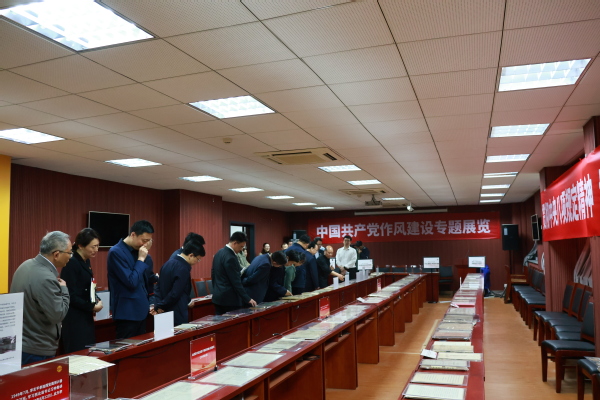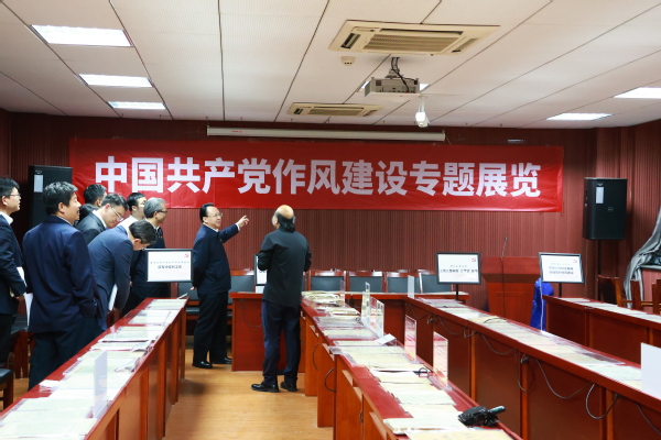 本次展览分为建党初期和土地革命时期红军中党的工作、抗日战争时期延安整风与反省坦白运动、解放战争时期三查三整和反“客里空”运动及新中国成立至今党的作风建设四个部分。包括各个历史时期的红军材料、党员学习笔记、自我反省材料、党员干部鉴定表等珍贵的原始资料。参观中,曹大臣教授为各位领导详细介绍了展品背后中国共产党作风建设的历史。