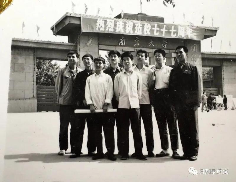 1978年高考,文科数学得高分的人不多,多数人也就考三四十分。而这张照片中前排手握一卷纸的那位同学,那年数学居然考了99分!而他考上的却是历史系而非数学系!有时我也慨叹:他当年若上的是数学系,如今让人揪心的蕊片大战中,说不定还会活跃着他的身影呢!(照片摄于1979年南大校门)
