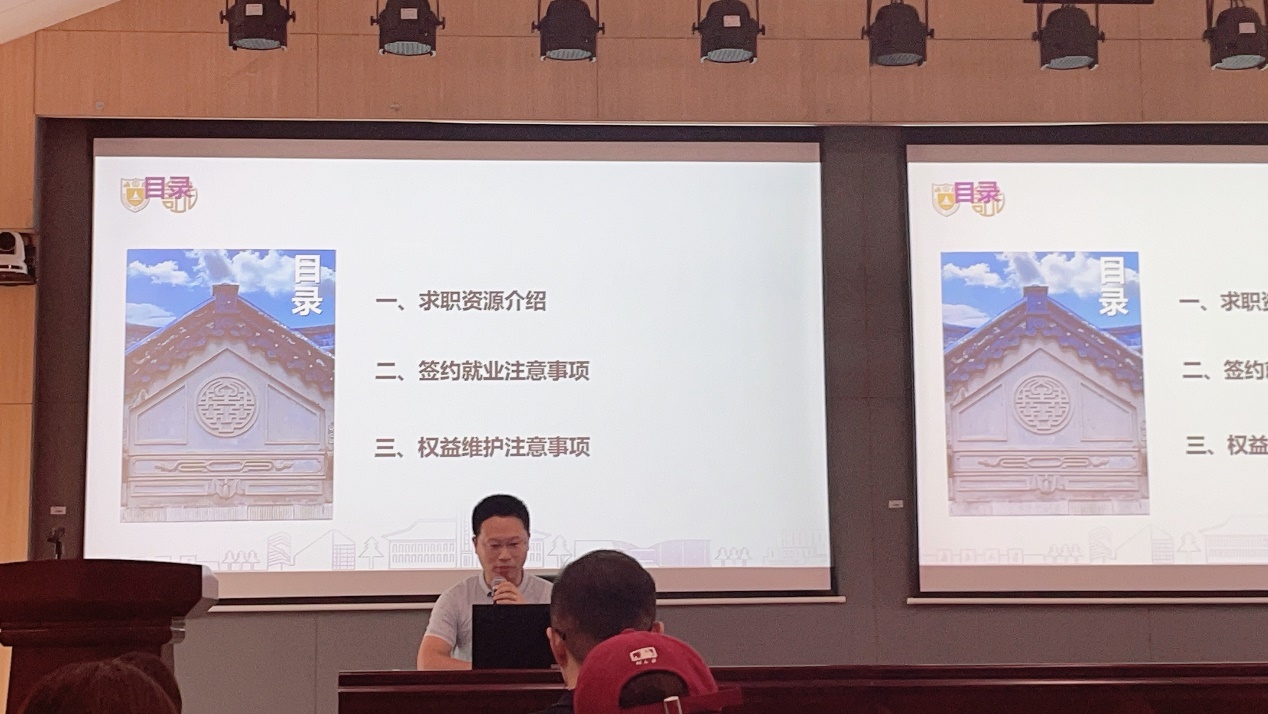 接着,王指南老师从“求职资源”“签约就业”“权益维护”三个方面为毕业生做指导,深入分析当前就业形势。同时,从校园招聘、获取信息、简历制作、资源查找等方面为同学们寻找心仪的工作提供建议,并就同学们在签约就业中常见的问题和误区进行解答,通过生动的案例分析告知同学们应该如何进行自身的就业权益维护。