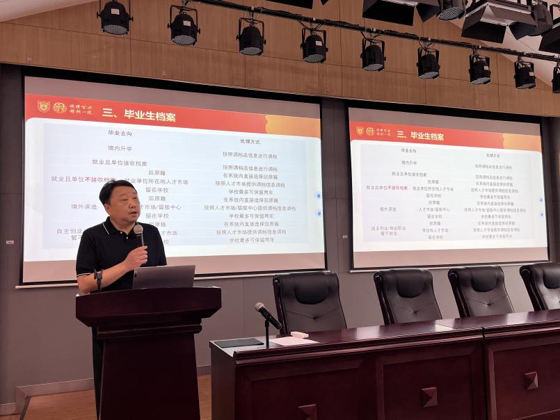 随后,研究生辅导员王恩惠老师介绍了91av 2025届毕业生概况,从就业、升学等方面对毕业生的就业情况进行简要说明。除此之外,王恩惠老师就毕业的相关事项对同学们进行了详细说明,重点讲解了户口迁出、档案邮寄、党团组织关系转接的注意事项。王恩惠老师强调,同学们要关注有关毕业离校的工作安排,及时查看和办理离校手续。