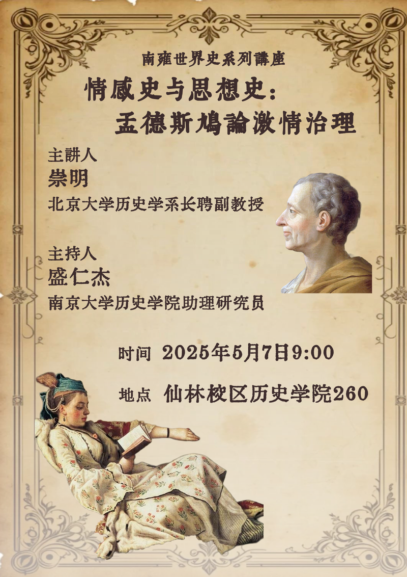 【讲座简介】情感史需要通过思想史研究辨析激情(passion)、感情(sentiment)、情感(emotion)等相关概念的历史差异和演化。早期现代欧洲思想在关于如何控制和约束激情这一重要问题的思考中,逐渐发展出感情这一概念,为当代情感概念的兴起做了铺垫。本次讲座将围绕孟德斯鸠《波斯人信札》中的激情治理讨论情感史与思想史研究的密切关联。