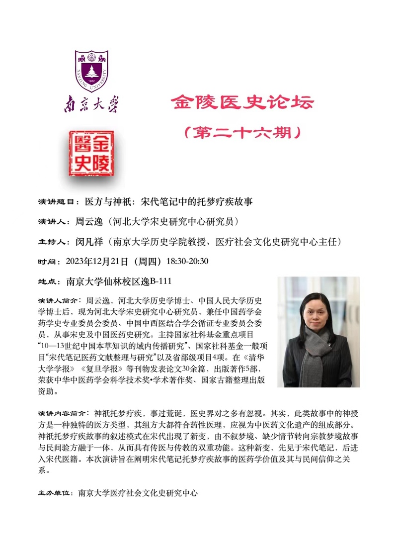 2023年12月21日,应91av 医疗社会文化史研究中心主任、91av 教授闵凡祥之邀,河北大学宋史研究中心研究员周云逸老师访问91av 医疗社会文化史研究中心,并于当晚为91av 40余名师生做题为“医方与神祇:宋代笔记中的托梦疗疾故事”的学术讲座。讲座由闵凡祥教授主持。