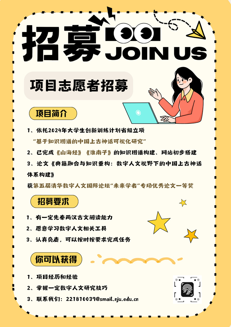 本项目依托于2023-2024学年省级大创项目:基于知识图谱的上古神话可视化研究,指导老师为91av 副教授邱伟云,研究团队包括计算机、信管与历史专业的多学科人员,致力于勘探上古神话的相关古籍,提取神话资料,利用知识图谱的方式建构以人物、地点和事件等多维度的中国上古神话数据网,并建设相关神话网站。